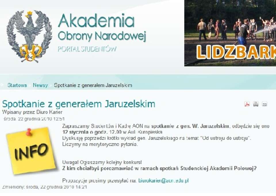 Sprawdziliśmy. Faktycznie, na stronie Portalu Studentów Akademii Obrony Narodowej widniało ładnie wyeksponowane zaproszenie na spotkanie z Wojciechem Jaruzelskim o zacytowanej przez naszego Czytelnika treści.