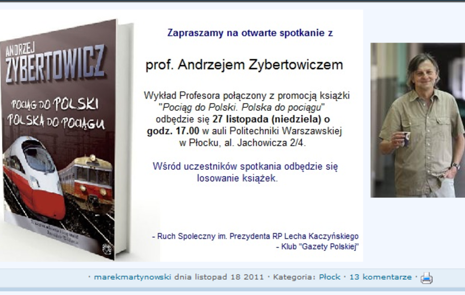 Publikacja dostępna na stronie: https://wpolityce.pl/polityka/122335-plock-spotkanie-z-prof-andrzejem-zybertowiczem-polaczony-z-promocja-ksiazki-pociag-do-polski