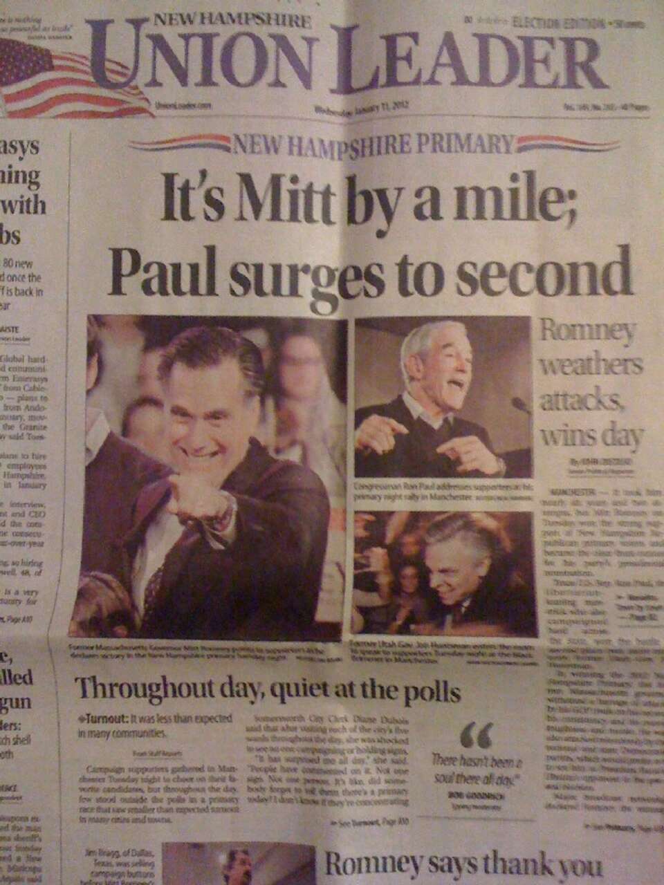 Drugie miejsce i 24 proc. w New Hampshire tylko rozgrzały zwolenników kongresmana Paula, przedstawiającego się jako czempion „wolności osobistej i Konstytucji”. – Mówią o nas, że jesteśmy niebezpieczni. Tak, jesteśmy niebezpieczni dla status quo – mówił Paul we wtorek na wieczorze wyborczym do rozentuzjazmowanych zwolenników, zapowiadając że „rewolucja” będzie trwać do końca prawyborów w lecie.