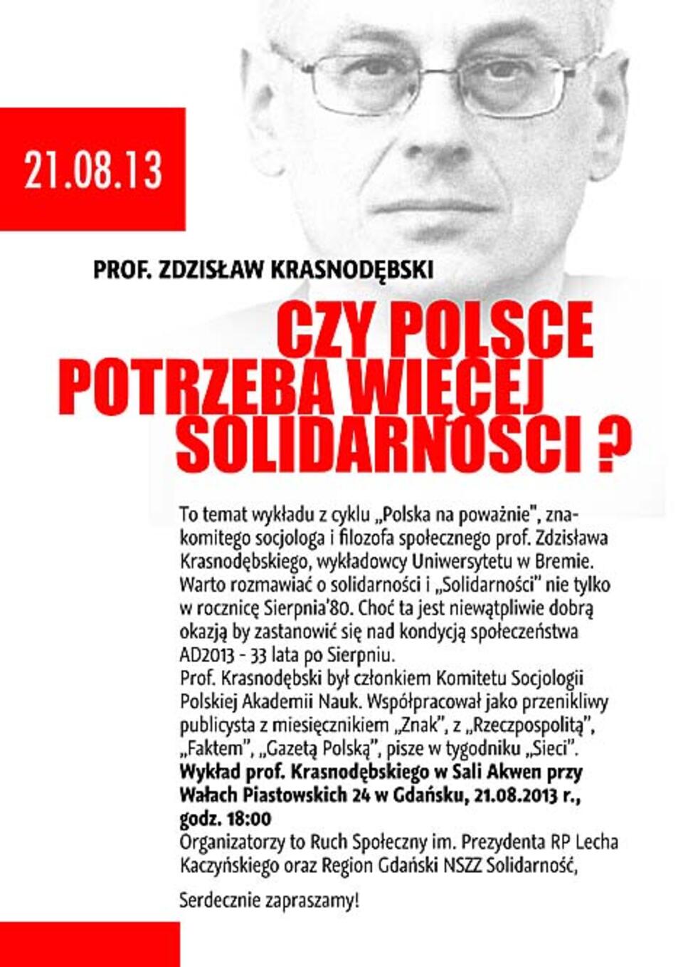 W cyklu wykładów „Polska na poważnie” profesor Zdzisław Krasnodębski, znakomity socjolog i filozof społeczny będzie gościć w Gdańsku. Zapraszamy do Sali Akwen, Gdańsk, ul. Wały Piastowskie 24, 21 sierpnia br. na godz. 18.