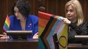 Żukowska z tęczową flagą opowiada o "członkach, członkiniach i osobach członkowskich". Większą flagę przyniosła Łoboda